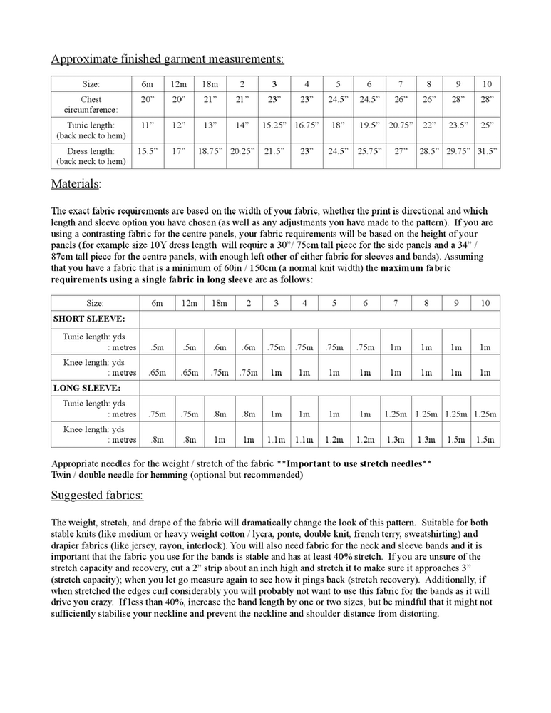 This striking knit dress has princess seams, a banded neckline, a gentle a-line shape in two different lengths (tunic / knee length), and options for banded cap sleeves or long sleeves. The separate panels and princess seams give ample opportunity for fun colour-blocking and print mixing. In a single colour or overall print the dress lends itself to a casual wardrobe staple that's cute thrown over leggings or tights, or use a contrasting print or colour in the centre panels for a striking look. The sizes included in the pattern range from 6m all the way through 10 yrs. Due to the slightly challenging nature of sewing princess seams and easing different curves into each other, I would class this an adventurous beginner or intermediate pattern but essentially, it's a very quick sew.