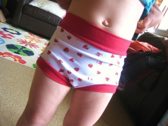 Tired of watching my kids constantly pulling at their underwear, I designed these boy cut briefs to offer more comfort and modesty than store-bought ones. The beauty of the design is a tall yoga waistband... no irritating elastic to dig into the waist and the added modesty of being able to wear the band up in the back to fully cover little bottoms. The body of the briefs is a single unseamed piece to reduce irritation. The legs are bound with knit fabric and not elastic so they stay put and there's no wedgies in sight! Although roomy enough for boy bits, this underwear design is also great for girls.
