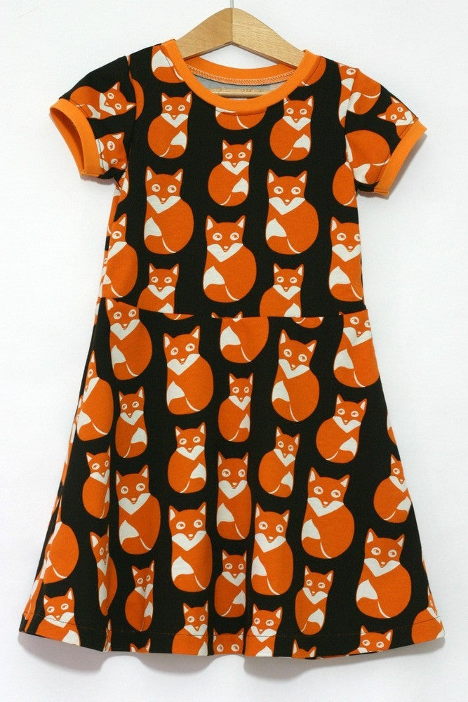 This funky yet functional knit dress has a fitted bodice, high neckline and a curved flared skirt. With a generous cut, the dress is designed to be worn for up to two years per size, here the skirt hits at the knee in the first year and just above the knee in year two. There are options for a sleeveless, short sleeve and long sleeve version, with bodice pieces drafted specifically for either sleeved for sleeveless . It's a perfect garment if you are new to sewing knits and very quick to sew up. I have bonus content on my blog with pattern pieces for 6-12m and 12-18m, as well as a tutorial for how to turn this into a peplum top! You can find it here: http://kitschycoo.blogspot.co.uk/search/label/skater%20dress%20bonus%20content